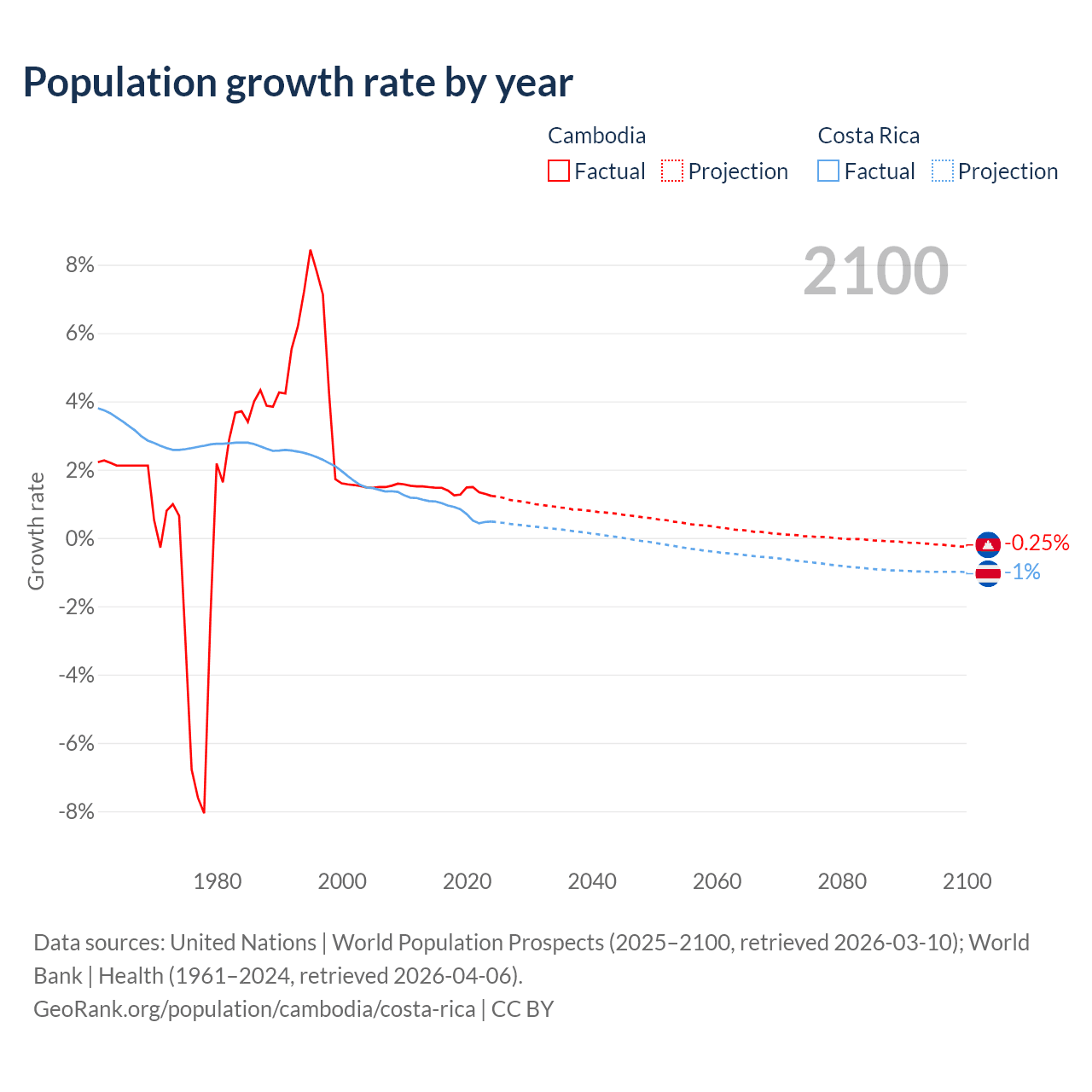 - For the last 10 years, Cambodia has had an average growth rate of +1.38% per year vs +0.77% in Costa Rica.