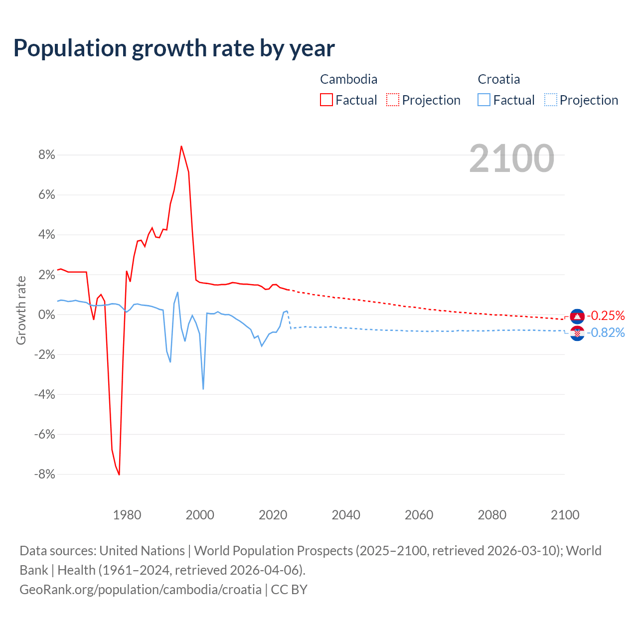 - For the last 10 years, Cambodia has had an average growth rate of +1.38% per year vs -0.82% in Croatia.