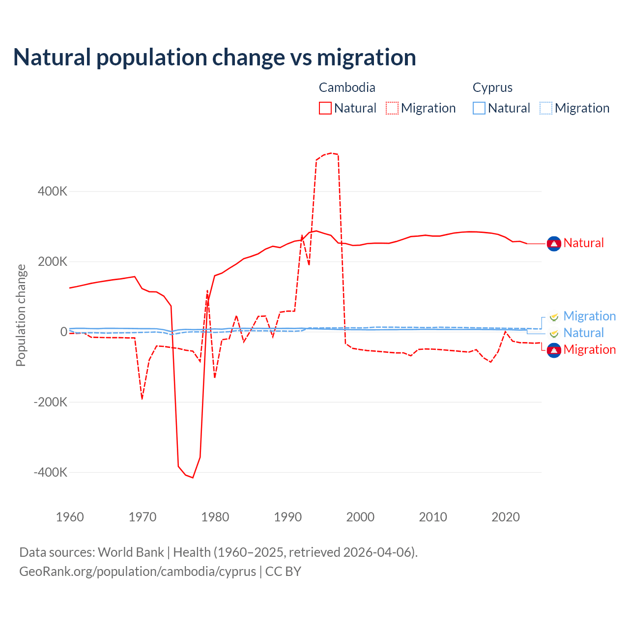 Over the last 10 years, 85.2% of the population change in Cambodia is from natural causes (a gain of 2,724,147 people) and 14.8% is from migration (a loss of 474,505 people). In Cyprus 36.2% is from natural causes (a gain of 57,464 people) and 63.8% is from migration (a gain of 101,458 people).