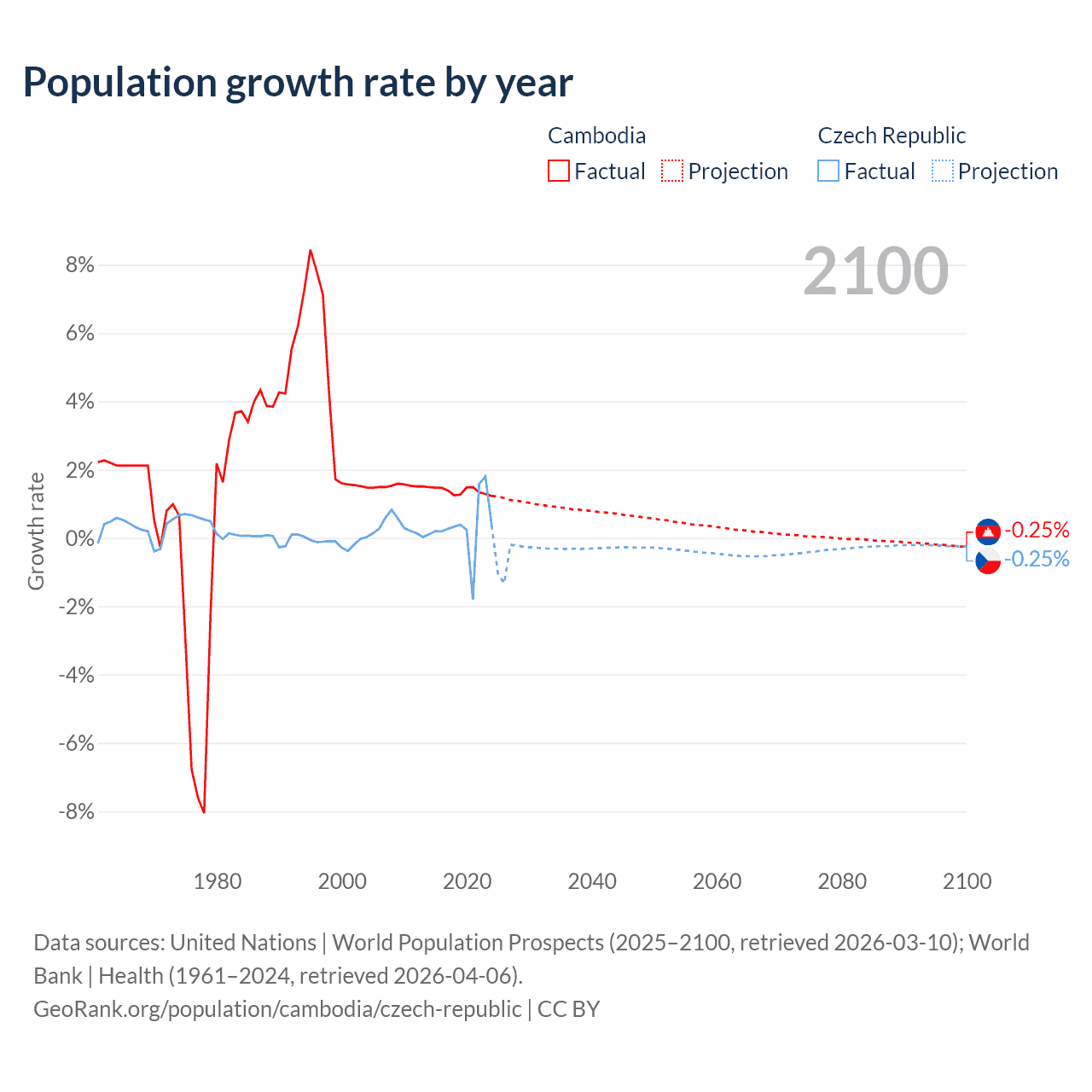 - For the last 10 years, Cambodia has had an average growth rate of +1.38% per year vs +0.34% in the Czech Republic.
