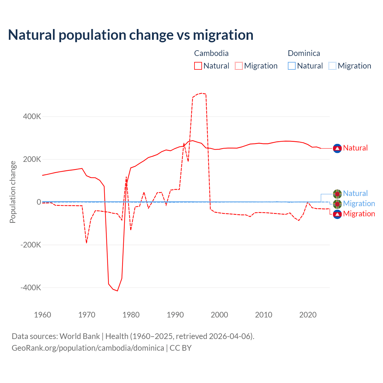 Over the last 10 years, 85.2% of the population change in Cambodia is from natural causes (a gain of 2,724,147 people) and 14.8% is from migration (a loss of 474,505 people). In Dominica 4.63% is from natural causes (a loss of 190 people) and 95.4% is from migration (a loss of 3,914 people).