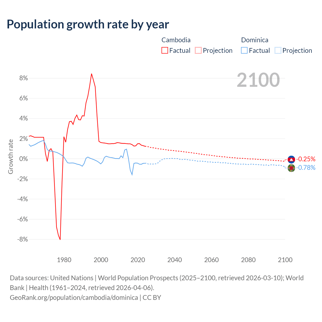 - For the last 10 years, Cambodia has had an average growth rate of +1.38% per year vs -0.47% in Dominica.