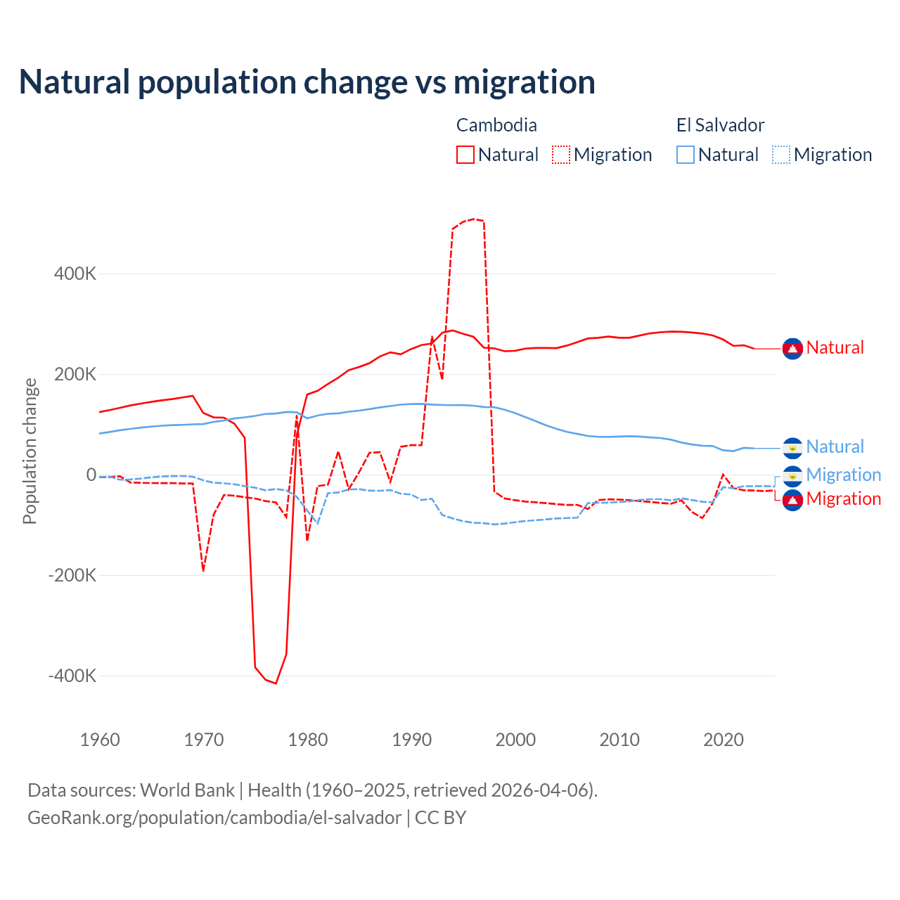 Over the last 10 years, 85.2% of the population change in Cambodia is from natural causes (a gain of 2,724,147 people) and 14.8% is from migration (a loss of 474,505 people). In El Salvador 58.8% is from natural causes (a gain of 579,641 people) and 41.2% is from migration (a loss of 406,874 people).