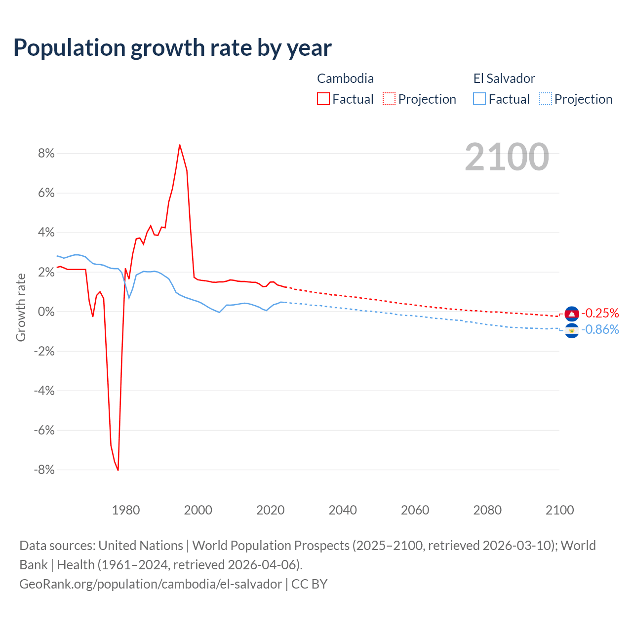 - For the last 10 years, Cambodia has had an average growth rate of +1.38% per year vs +0.29% in El Salvador.