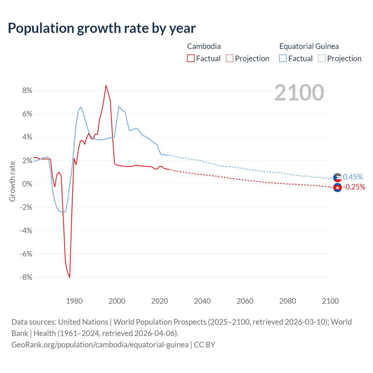- For the last 10 years, Cambodia has had an average growth rate of +1.38% per year vs +3.15% in Equatorial Guinea.