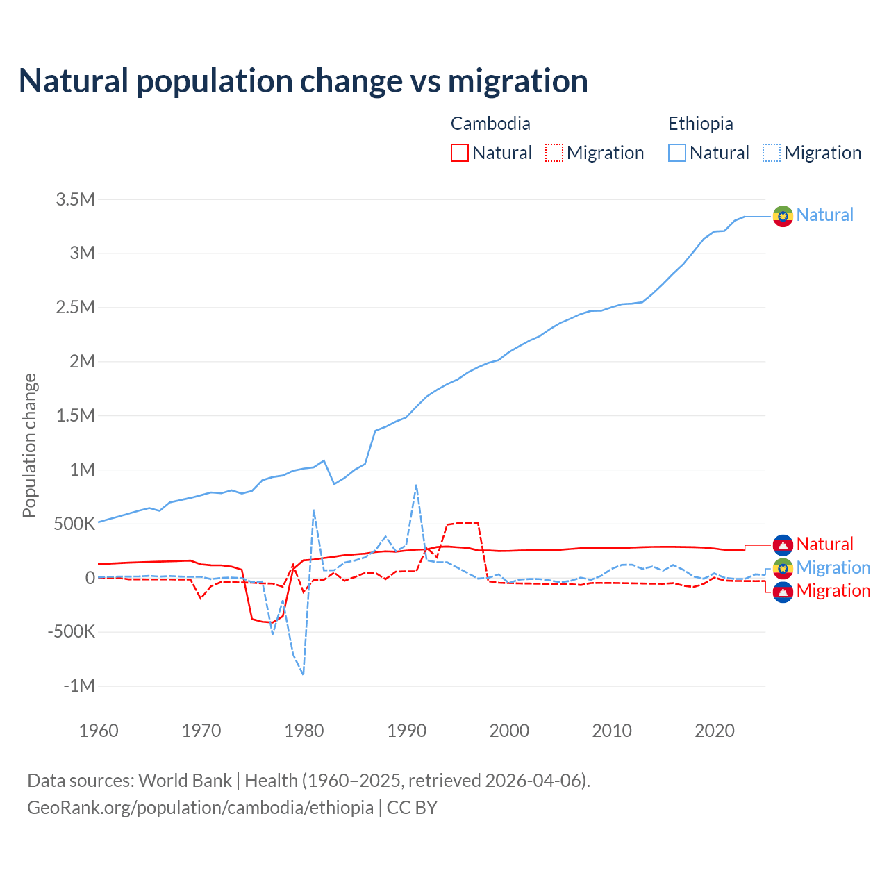 Over the last 10 years, 85.2% of the population change in Cambodia is from natural causes (a gain of 2,724,147 people) and 14.8% is from migration (a loss of 474,505 people). In Ethiopia 98.8% is from natural causes (a gain of 30,237,373 people) and 1.19% is from migration (a gain of 365,488 people).