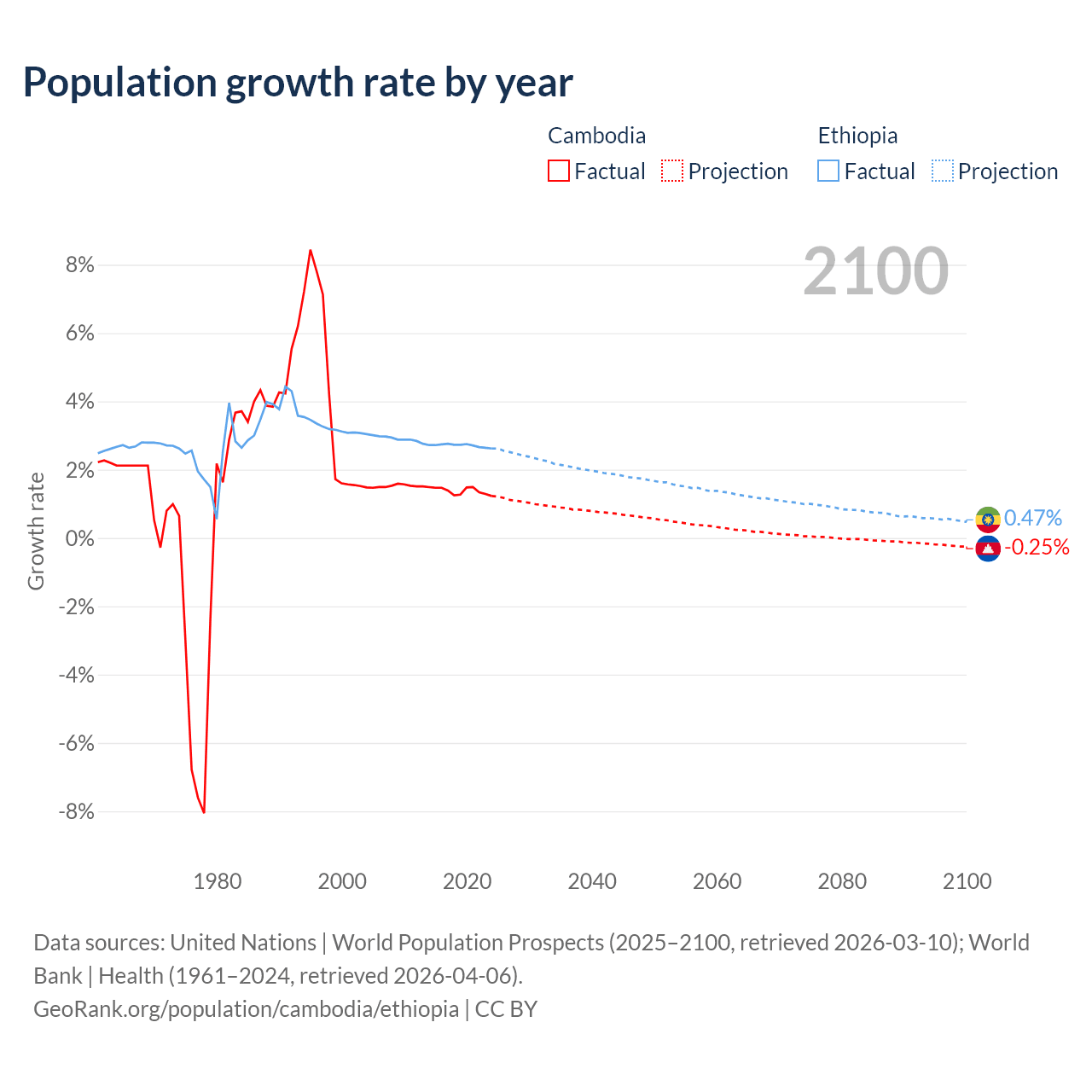 - For the last 10 years, Cambodia has had an average growth rate of +1.38% per year vs +2.71% in Ethiopia.