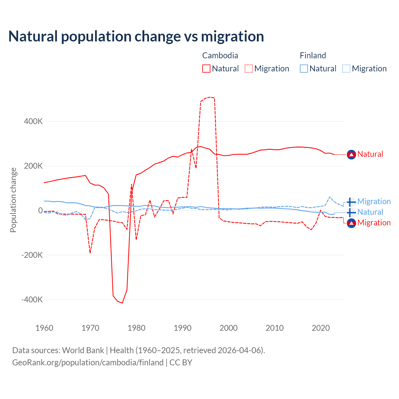 Over the last 10 years, 85.2% of the population change in Cambodia is from natural causes (a gain of 2,724,147 people) and 14.8% is from migration (a loss of 474,505 people). In Finland 22.5% is from natural causes (a loss of 65,560 people) and 77.5% is from migration (a gain of 225,237 people).