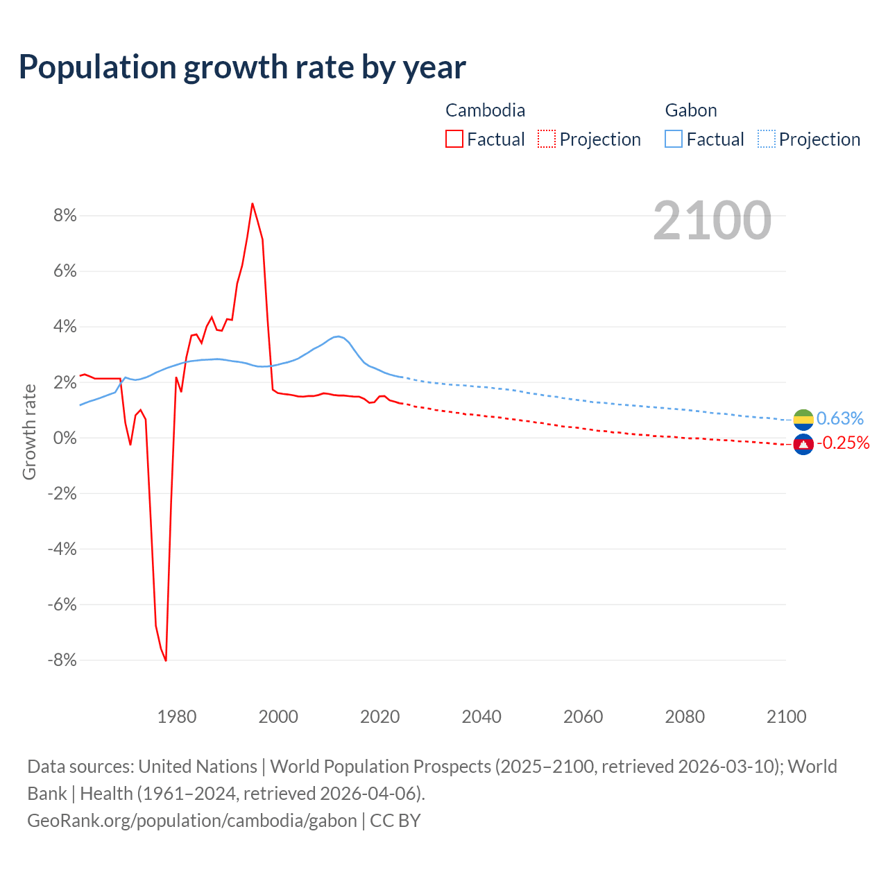 - For the last 10 years, Cambodia has had an average growth rate of +1.38% per year vs +2.61% in Gabon.