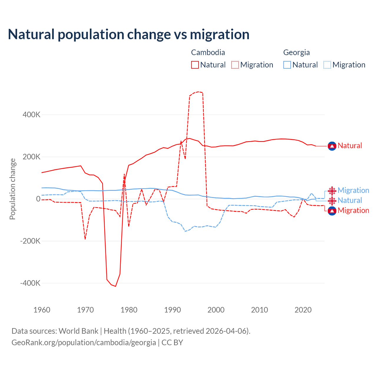 Over the last 10 years, 85.2% of the population change in Cambodia is from natural causes (a gain of 2,724,147 people) and 14.8% is from migration (a loss of 474,505 people). In Georgia 57.7% is from natural causes (a gain of 47,646 people) and 42.3% is from migration (a loss of 34,907 people).