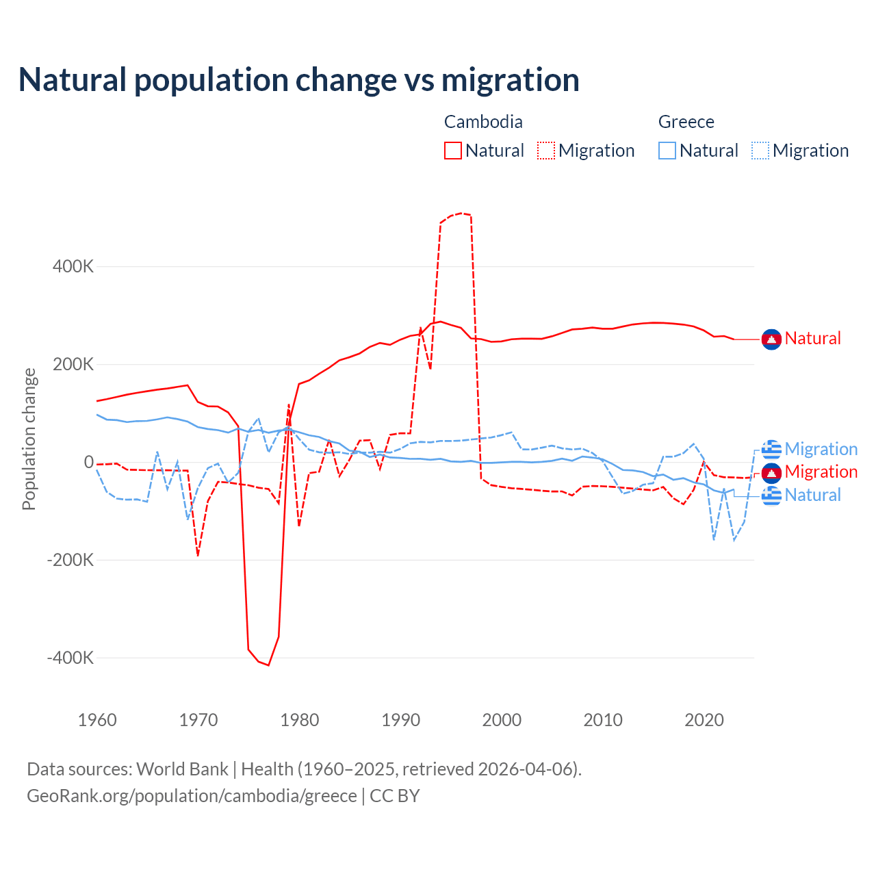 - Since 2006, the population of Cambodia has increased from 13.6M people to 18.1M (32.8% growth), while Greece has declined from 11M to 10.2M (7.61% decline).
