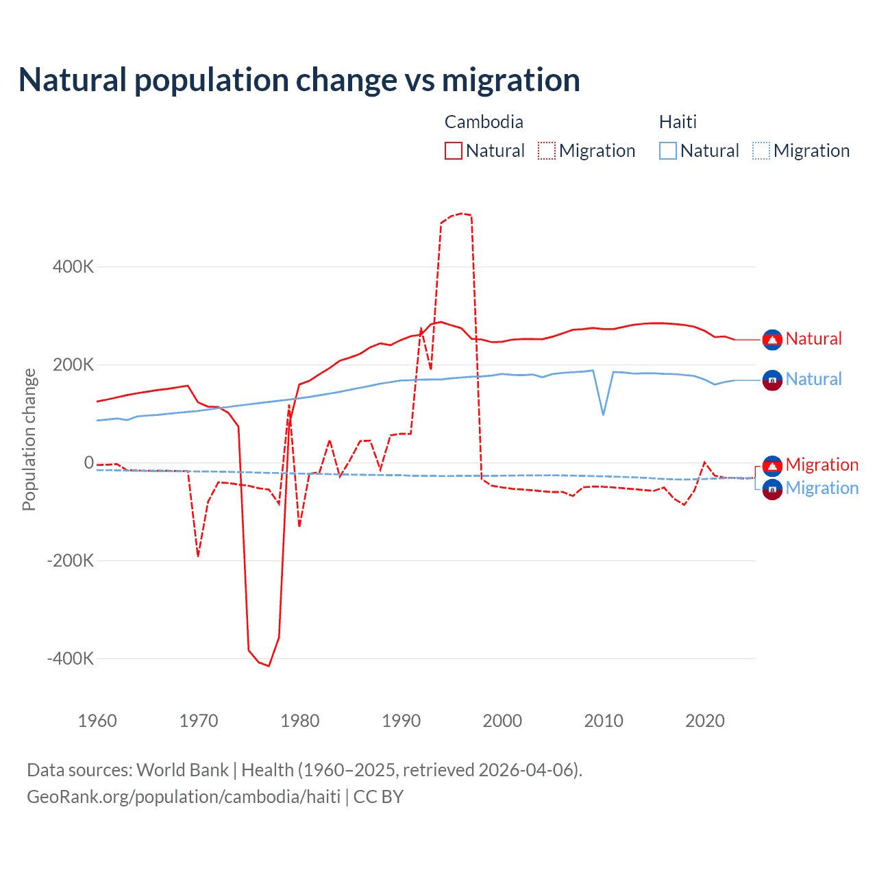 Over the last 10 years, 85.2% of the population change in Cambodia is from natural causes (a gain of 2,724,147 people) and 14.8% is from migration (a loss of 474,505 people). In Haiti 83.9% is from natural causes (a gain of 1,740,319 people) and 16.1% is from migration (a loss of 333,076 people).