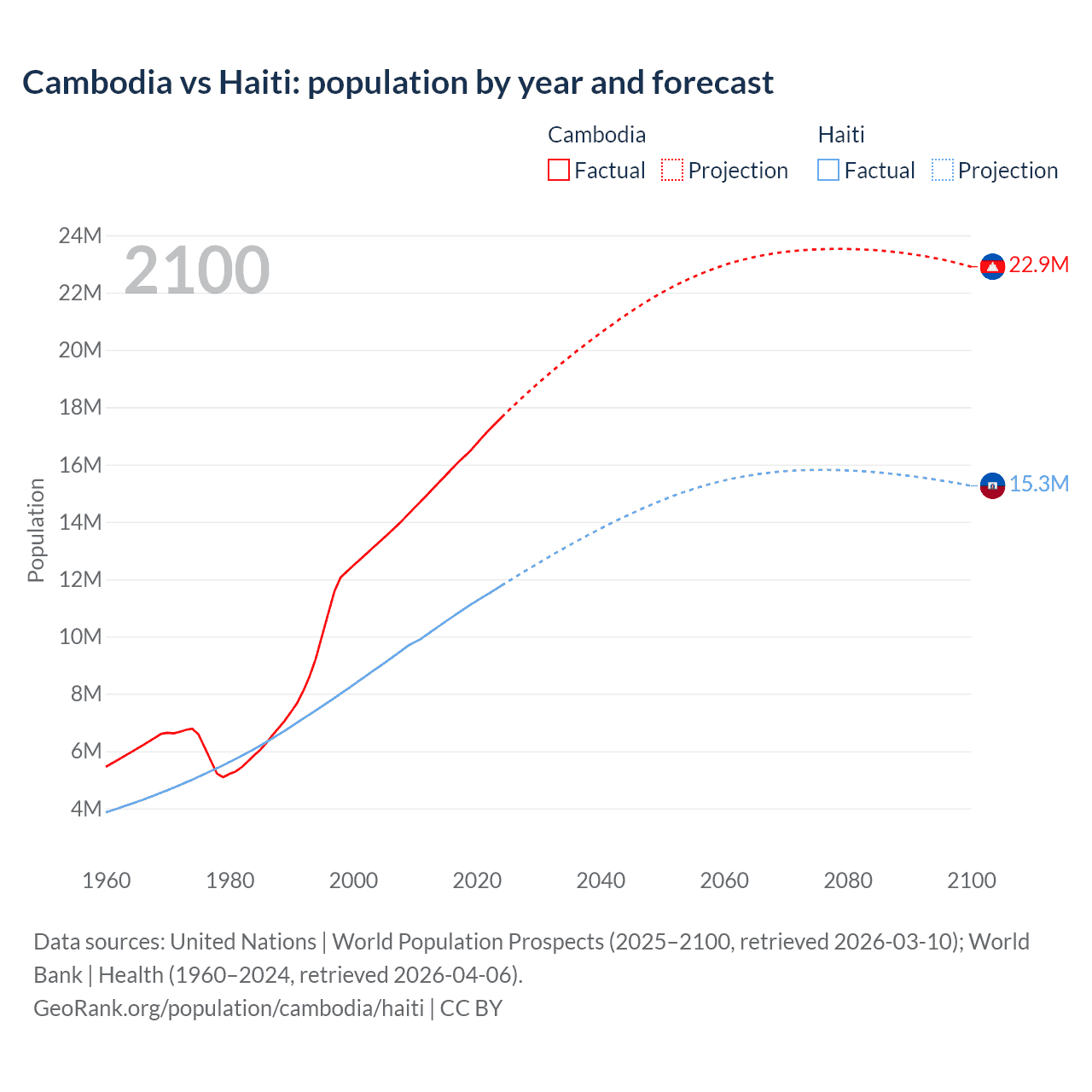 The latest officially reported population of Cambodia was 17,638,801 in 2024 vs 11,772,557 people in Haiti in 2024. In 2026, based on the adjusted UN estimation, the current Cambodia's population is 18,113,986 people compared to 12,076,663 in Haiti.
