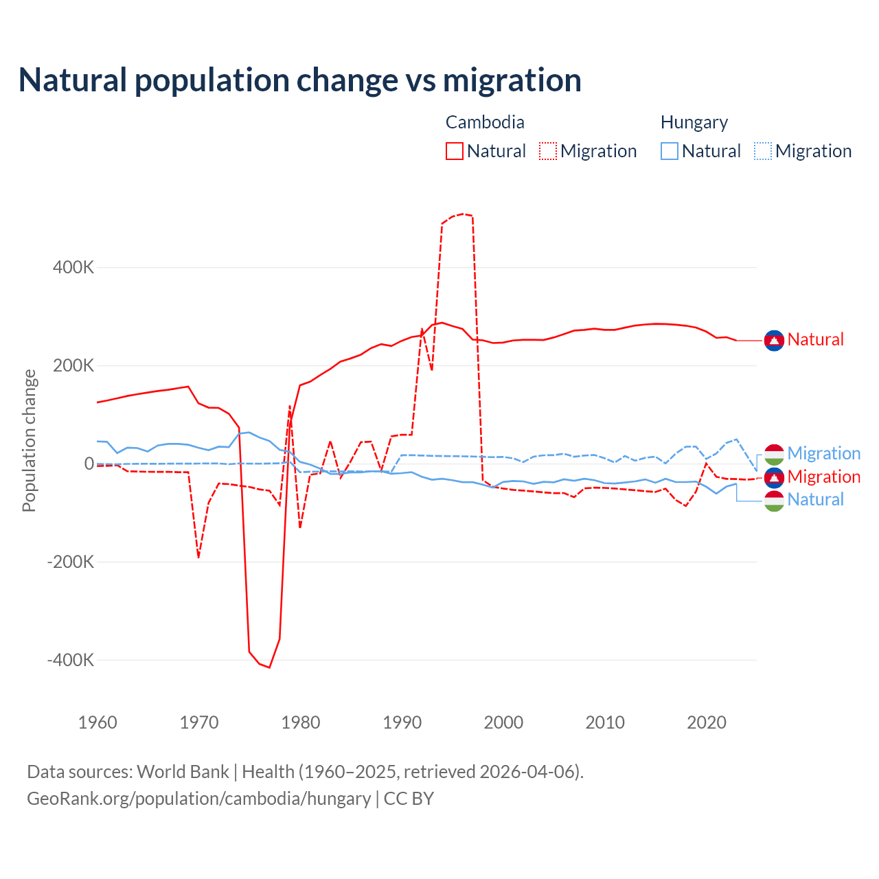 Over the last 10 years, 85.2% of the population change in Cambodia is from natural causes (a gain of 2,724,147 people) and 14.8% is from migration (a loss of 474,505 people). In Hungary 63.7% is from natural causes (a loss of 412,838 people) and 36.3% is from migration (a gain of 234,837 people).