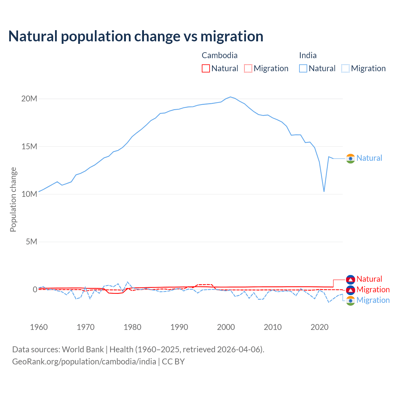 Over the last 10 years, 85.2% of the population change in Cambodia is from natural causes (a gain of 2,724,147 people) and 14.8% is from migration (a loss of 474,505 people). In India 96.4% is from natural causes (a gain of 145,503,378 people) and 3.56% is from migration (a loss of 5,376,884 people).