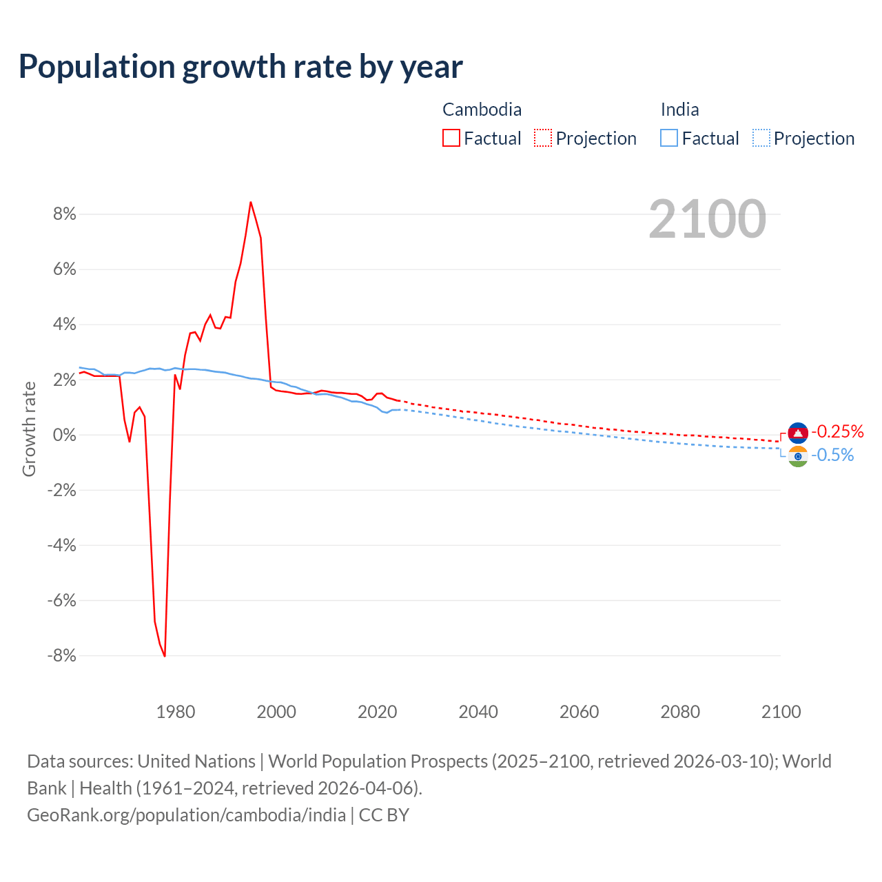 - For the last 10 years, Cambodia has had an average growth rate of +1.38% per year vs +1.03% in India.