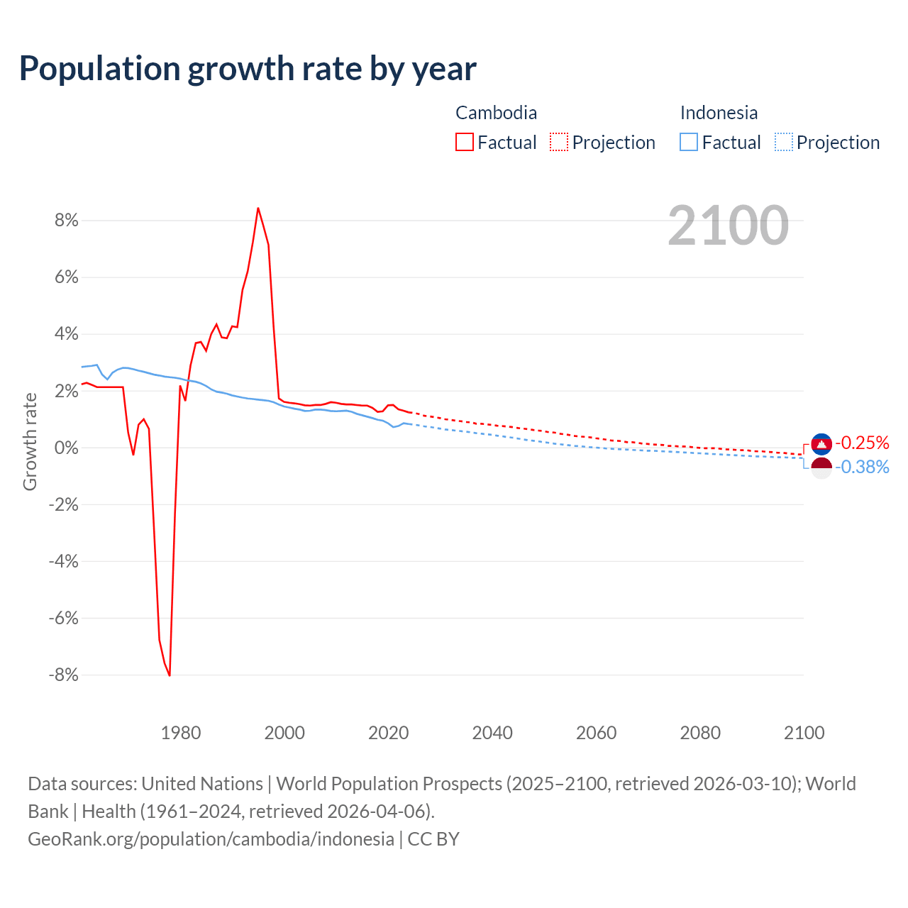 - For the last 10 years, Cambodia has had an average growth rate of +1.38% per year vs +0.94% in Indonesia.