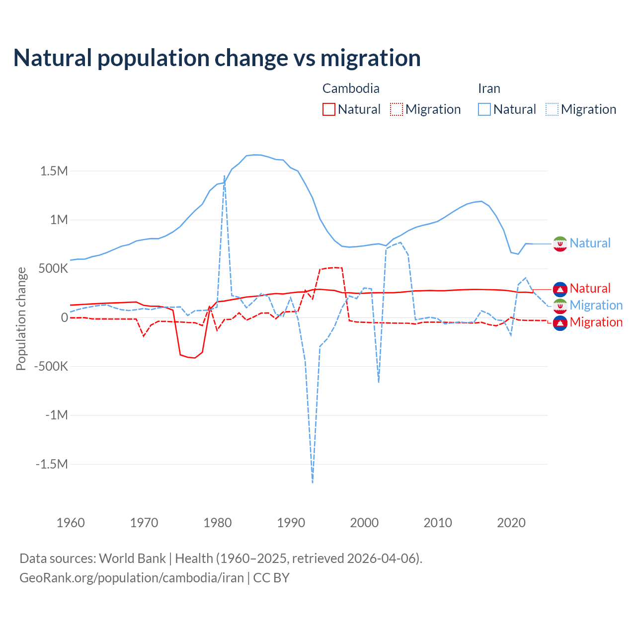 Over the last 10 years, 85.2% of the population change in Cambodia is from natural causes (a gain of 2,724,147 people) and 14.8% is from migration (a loss of 474,505 people). In Iran 92.5% is from natural causes (a gain of 9,405,860 people) and 7.46% is from migration (a gain of 757,979 people).