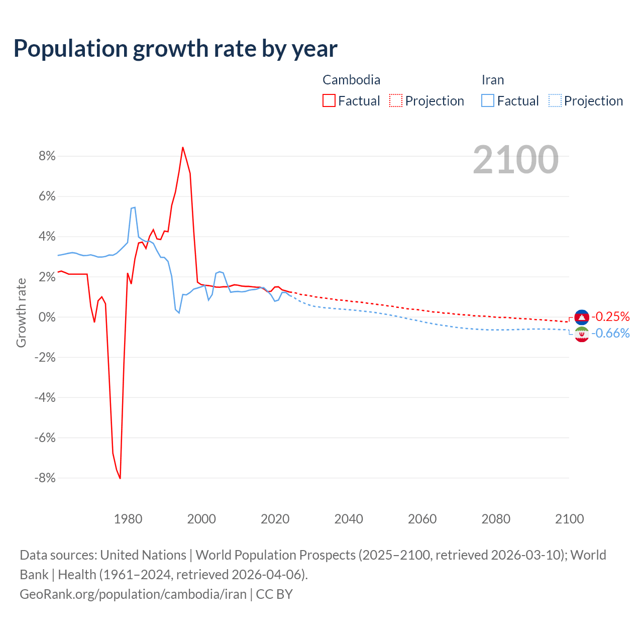 - For the last 10 years, Cambodia has had an average growth rate of +1.38% per year vs +1.19% in Iran.