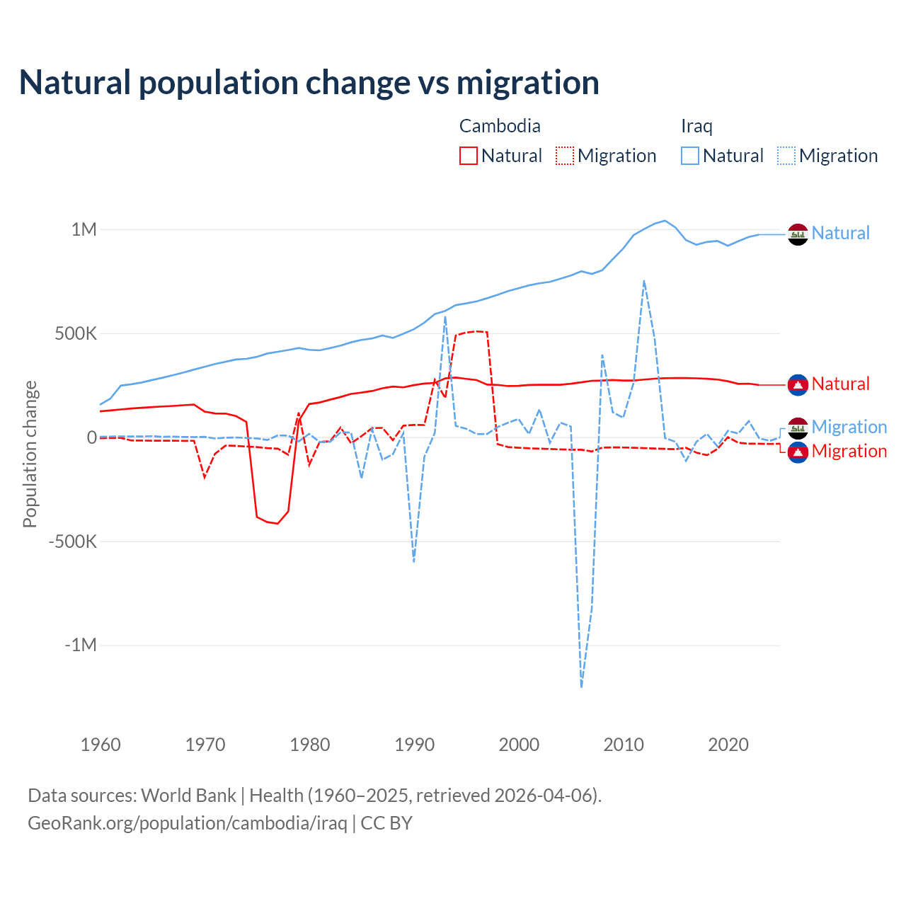 Over the last 10 years, 85.2% of the population change in Cambodia is from natural causes (a gain of 2,724,147 people) and 14.8% is from migration (a loss of 474,505 people). In Iraq 99.2% is from natural causes (a gain of 9,598,842 people) and 0.76% is from migration (a loss of 73,050 people).