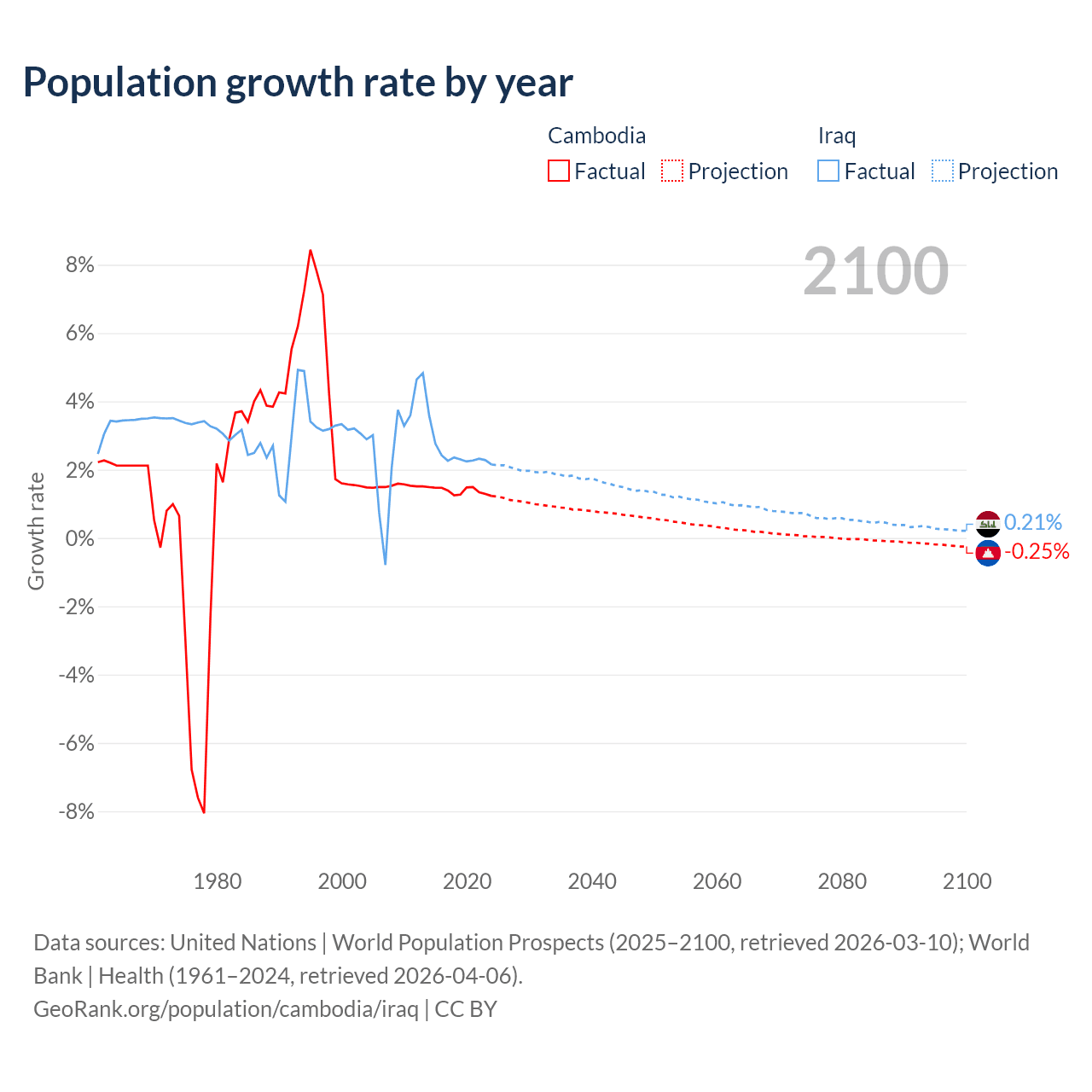 - For the last 10 years, Cambodia has had an average growth rate of +1.38% per year vs +2.45% in Iraq.