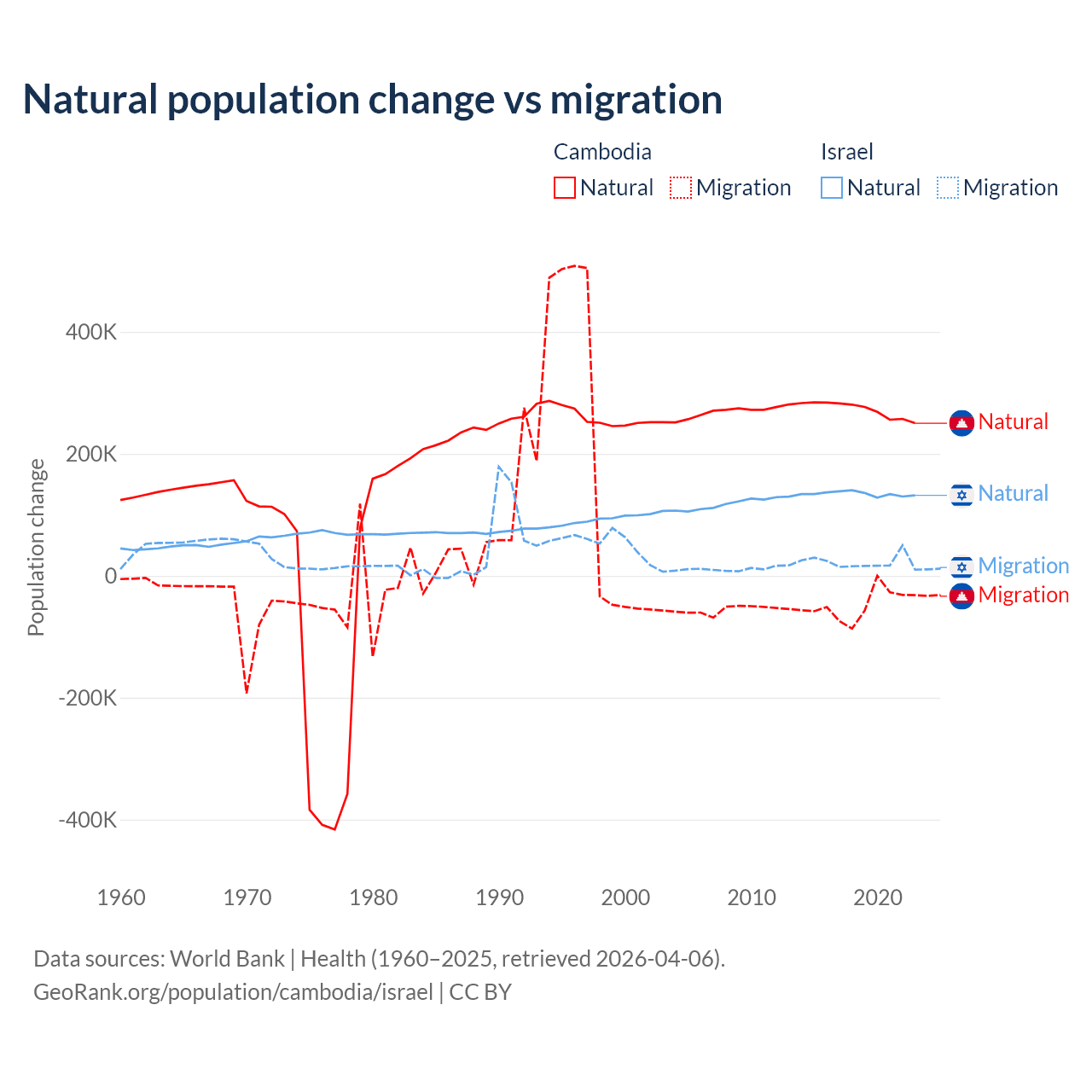 Over the last 10 years, 85.2% of the population change in Cambodia is from natural causes (a gain of 2,724,147 people) and 14.8% is from migration (a loss of 474,505 people). In Israel 86% is from natural causes (a gain of 1,343,492 people) and 14% is from migration (a gain of 219,048 people).
