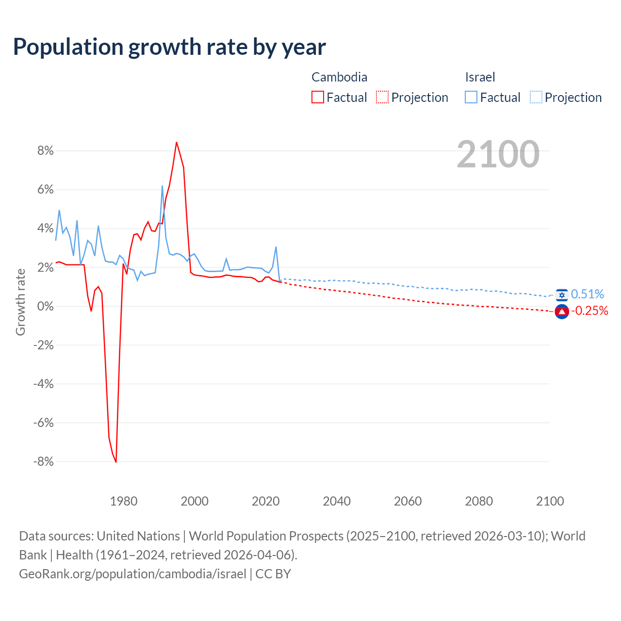 - For the last 10 years, Cambodia has had an average growth rate of +1.38% per year vs +1.96% in Israel.