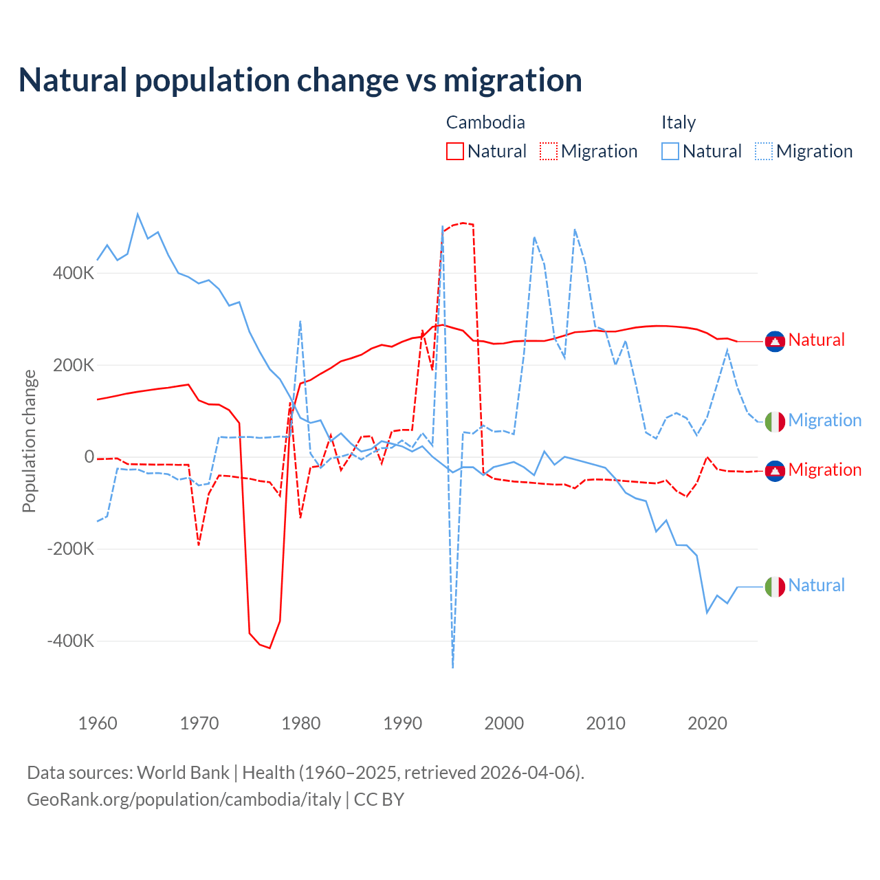 Over the last 10 years, 85.2% of the population change in Cambodia is from natural causes (a gain of 2,724,147 people) and 14.8% is from migration (a loss of 474,505 people). In Italy 68.6% is from natural causes (a loss of 2,239,084 people) and 31.4% is from migration (a gain of 1,026,128 people).
