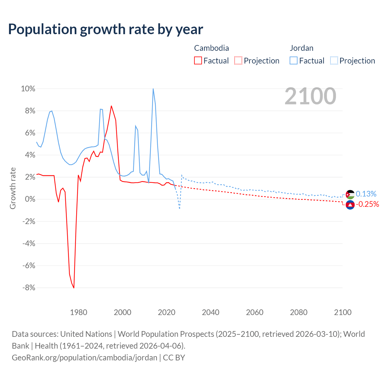 - For the last 10 years, Cambodia has had an average growth rate of +1.38% per year vs +3.45% in Jordan.