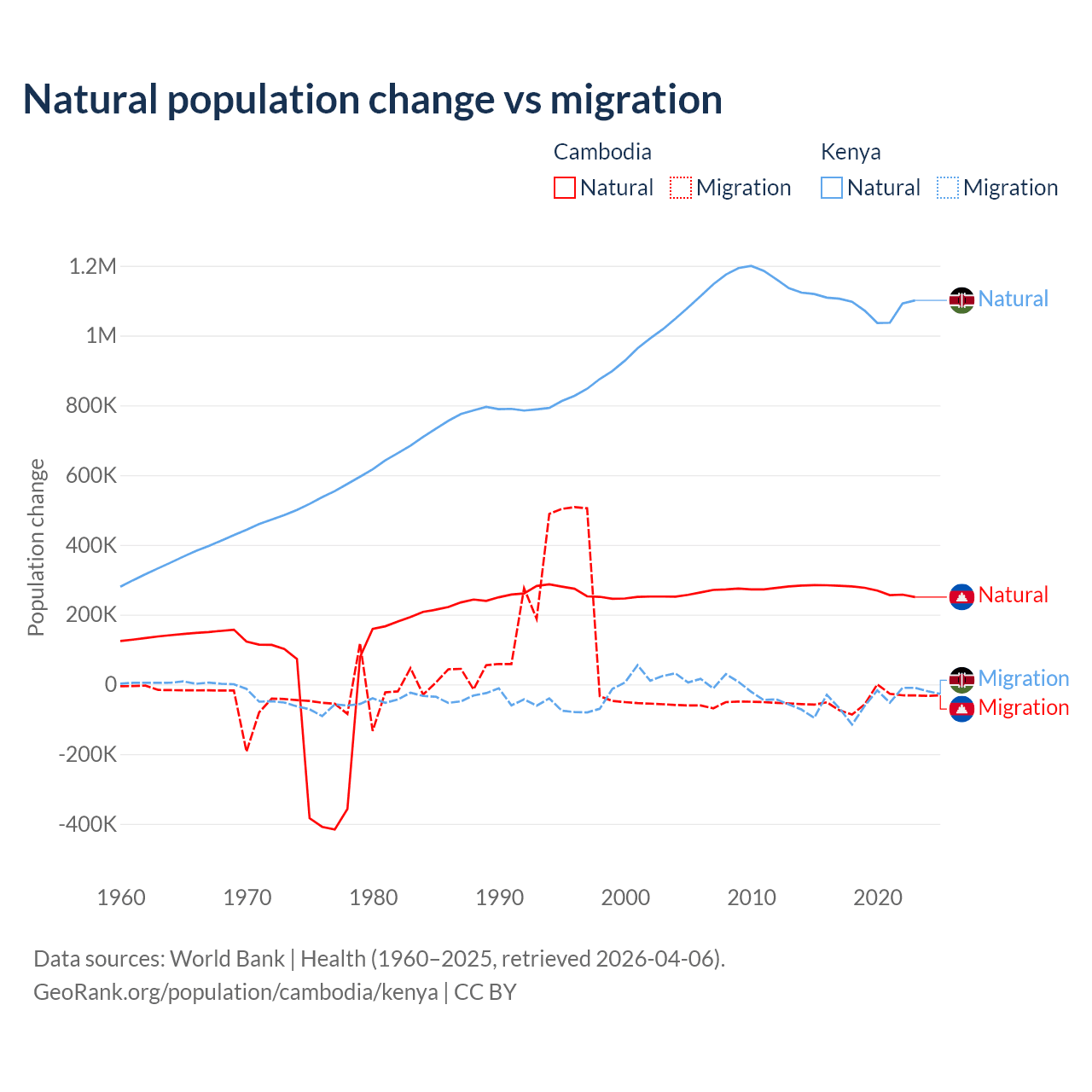 Over the last 10 years, 85.2% of the population change in Cambodia is from natural causes (a gain of 2,724,147 people) and 14.8% is from migration (a loss of 474,505 people). In Kenya 95.3% is from natural causes (a gain of 10,892,362 people) and 4.67% is from migration (a loss of 533,876 people).