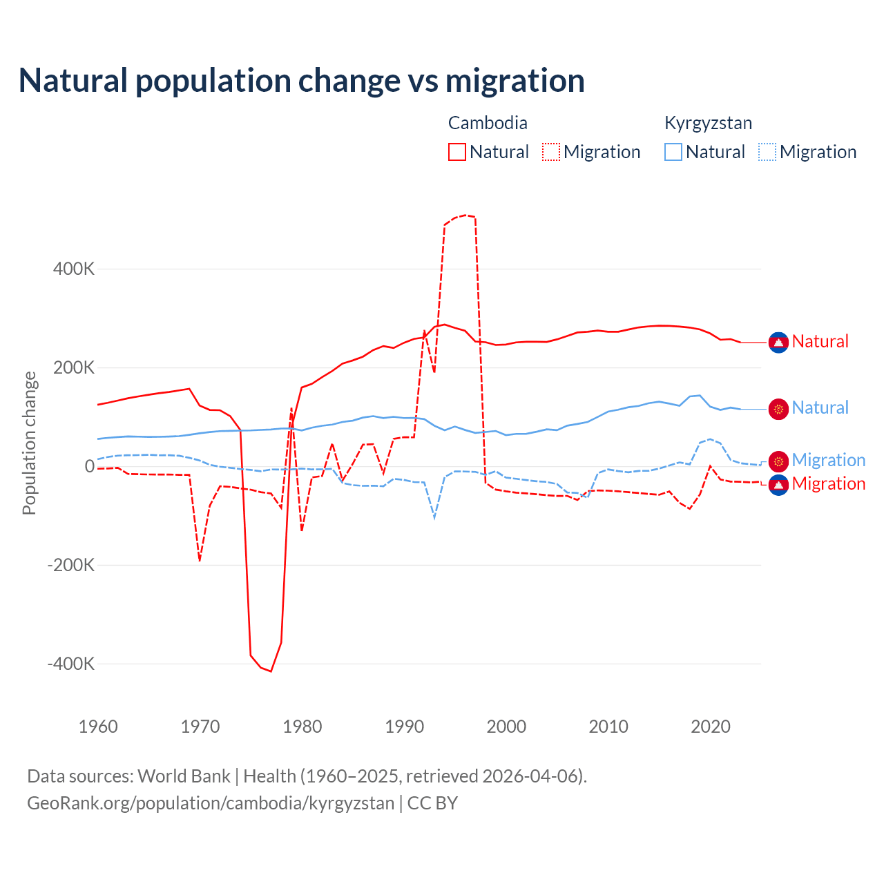 Over the last 10 years, 85.2% of the population change in Cambodia is from natural causes (a gain of 2,724,147 people) and 14.8% is from migration (a loss of 474,505 people). In Kyrgyzstan 88.5% is from natural causes (a gain of 1,258,837 people) and 11.5% is from migration (a gain of 164,132 people).