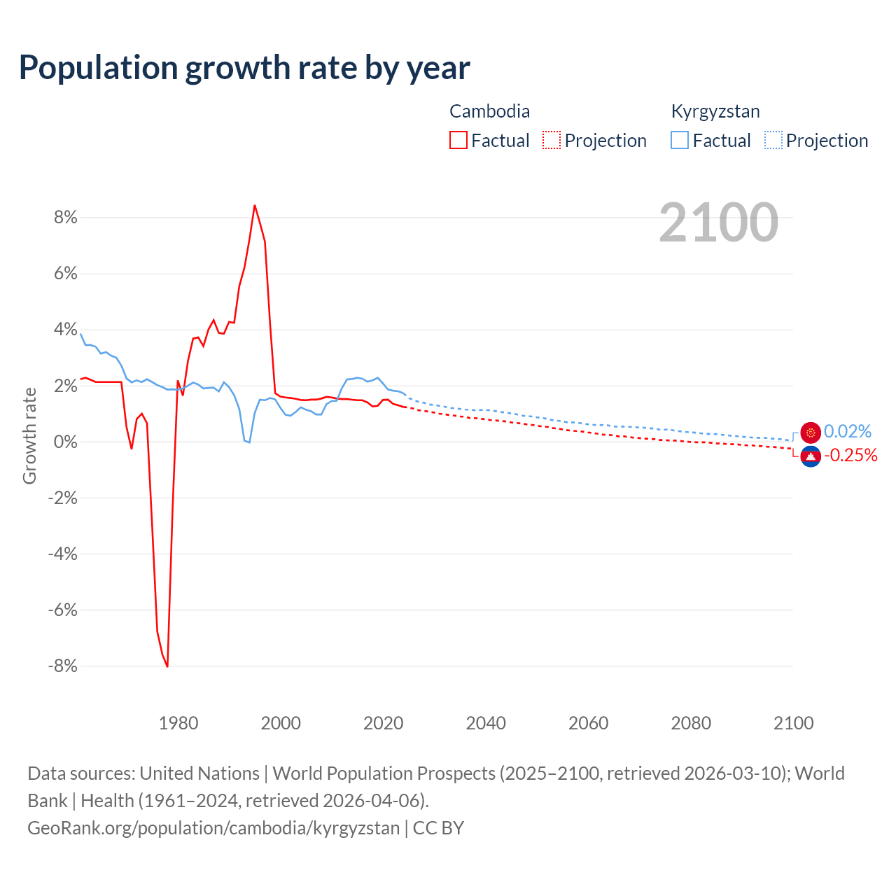 - For the last 10 years, Cambodia has had an average growth rate of +1.38% per year vs +2.05% in Kyrgyzstan.