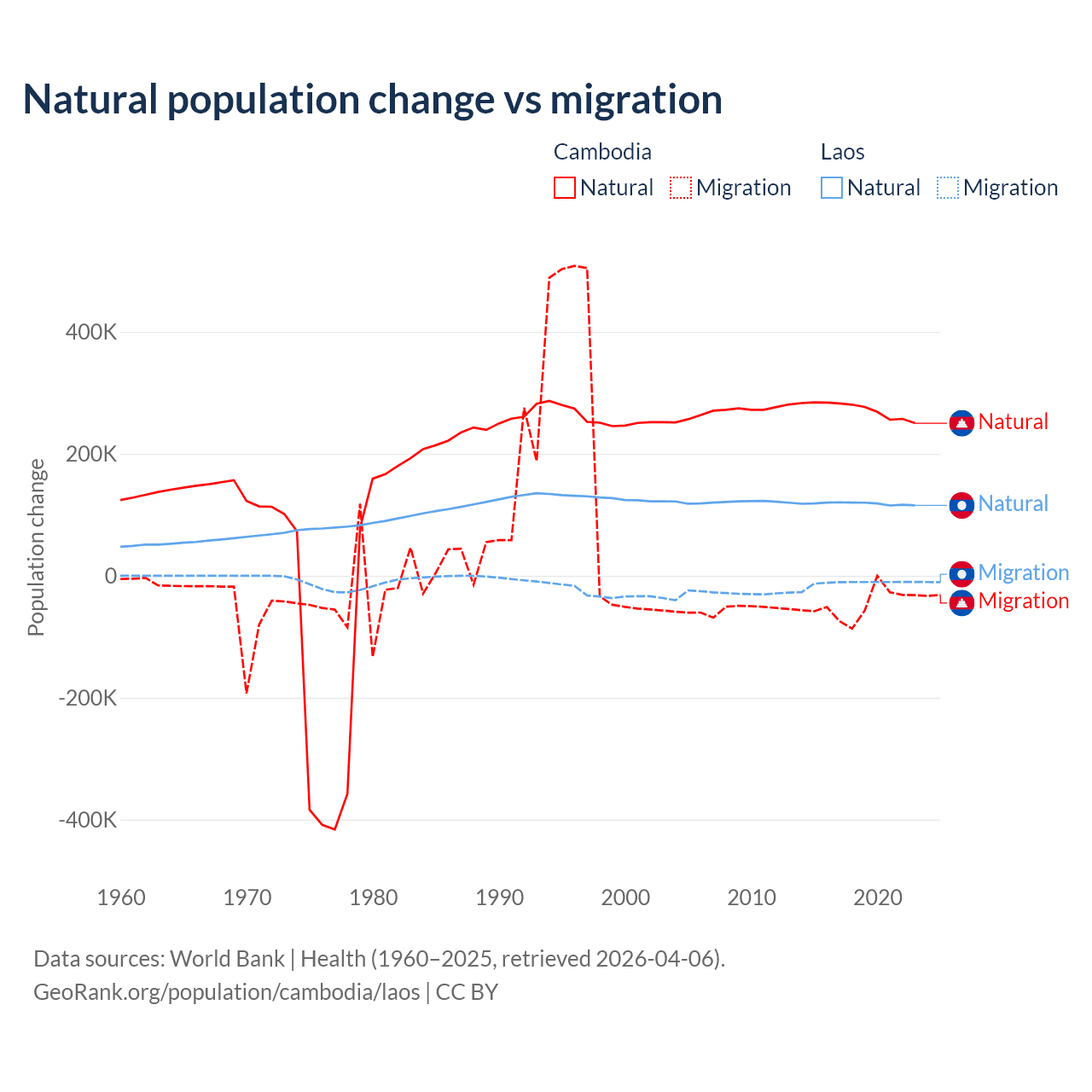 Over the last 10 years, 85.2% of the population change in Cambodia is from natural causes (a gain of 2,724,147 people) and 14.8% is from migration (a loss of 474,505 people). In Laos 90.6% is from natural causes (a gain of 1,183,013 people) and 9.41% is from migration (a loss of 122,899 people).
