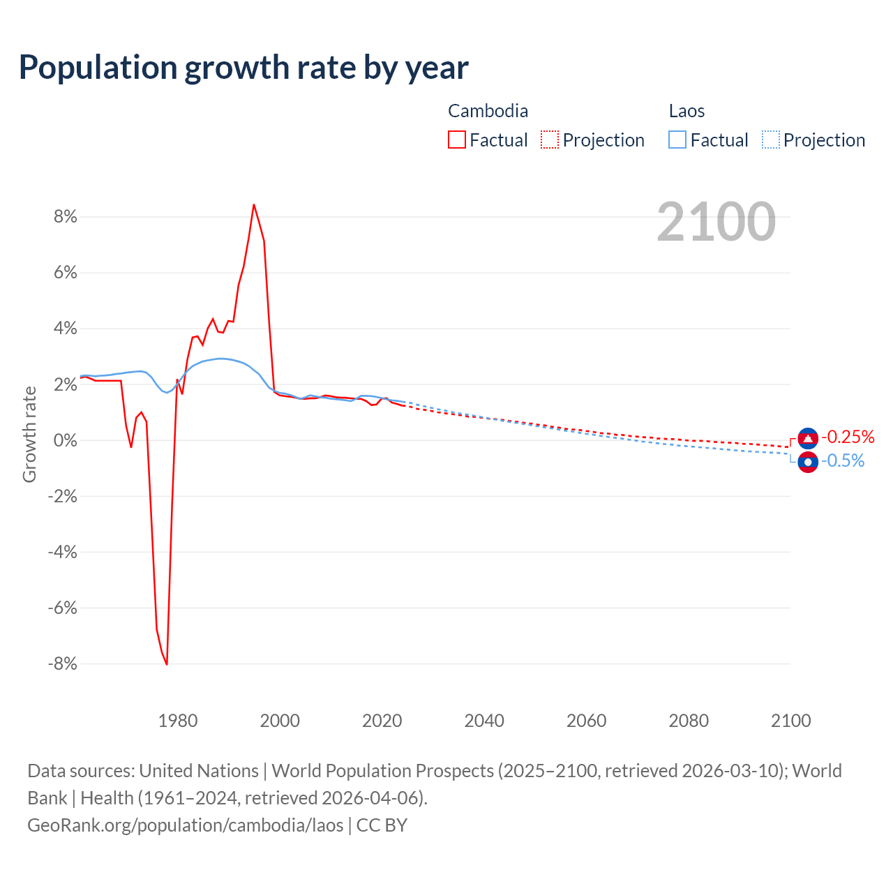 - For the last 10 years, Cambodia has had an average growth rate of +1.38% per year vs +1.48% in Laos.
