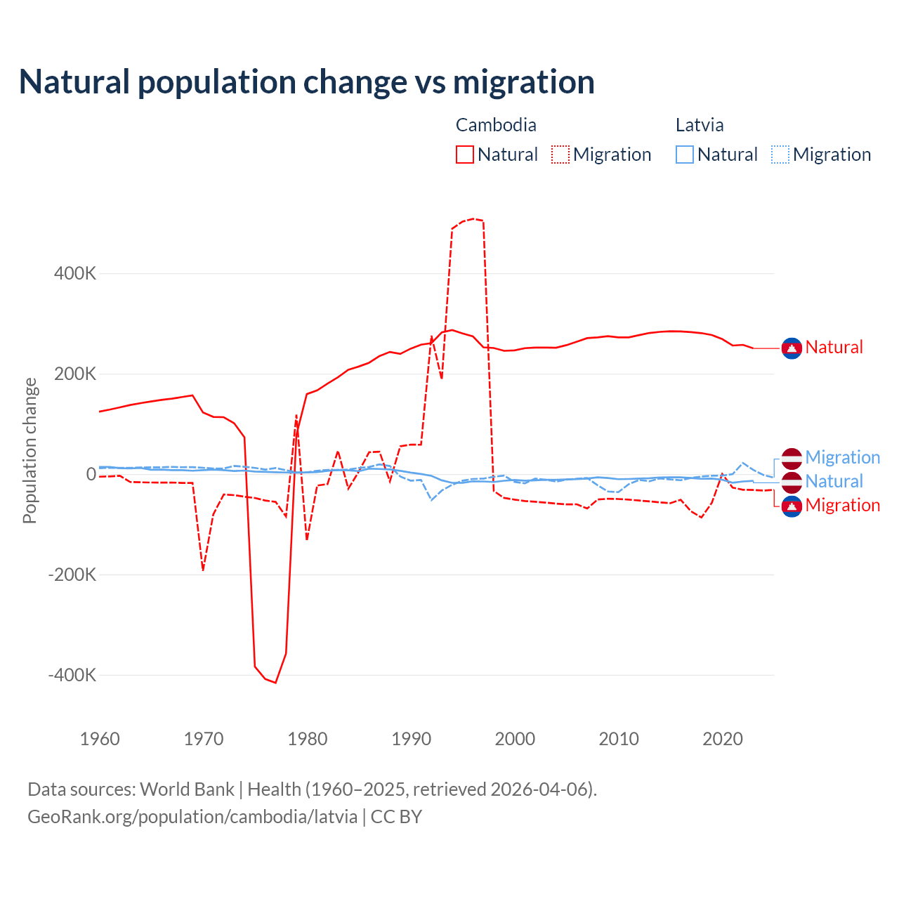 Over the last 10 years, 85.2% of the population change in Cambodia is from natural causes (a gain of 2,724,147 people) and 14.8% is from migration (a loss of 474,505 people). In Latvia 82.7% is from natural causes (a loss of 103,711 people) and 17.3% is from migration (a loss of 21,641 people).