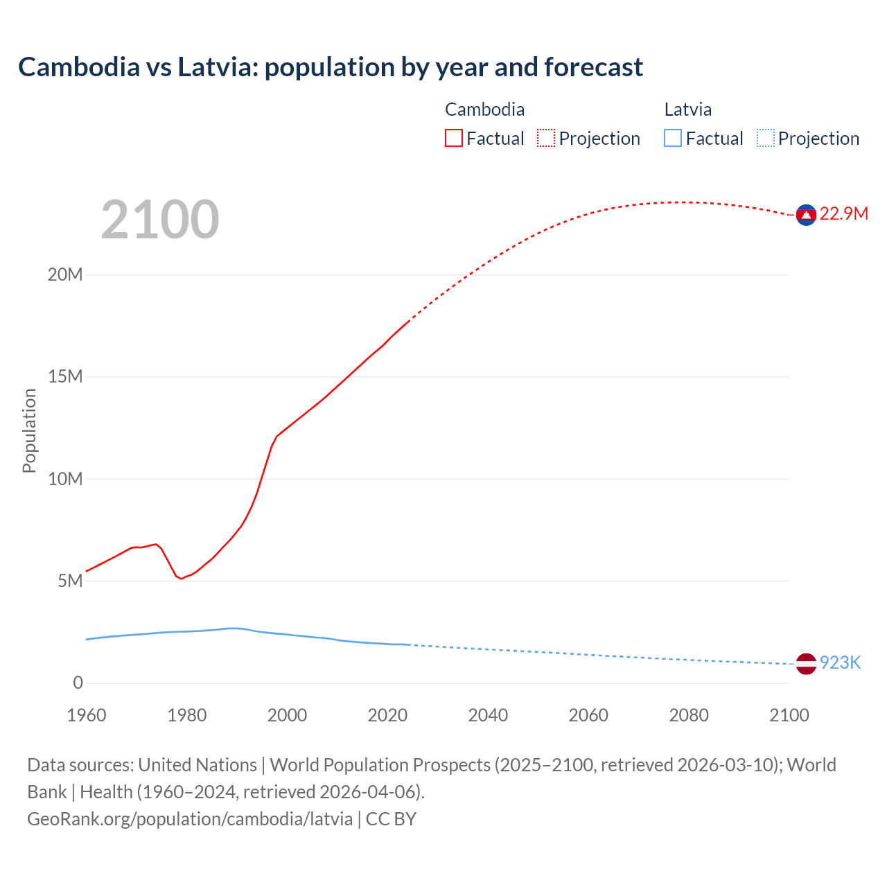 The latest officially reported population of Cambodia was 17,638,801 in 2024 vs 1,866,124 people in Latvia in 2024. In 2026, based on the adjusted UN estimation, the current Cambodia's population is 18,113,986 people compared to 1,829,763 in Latvia.