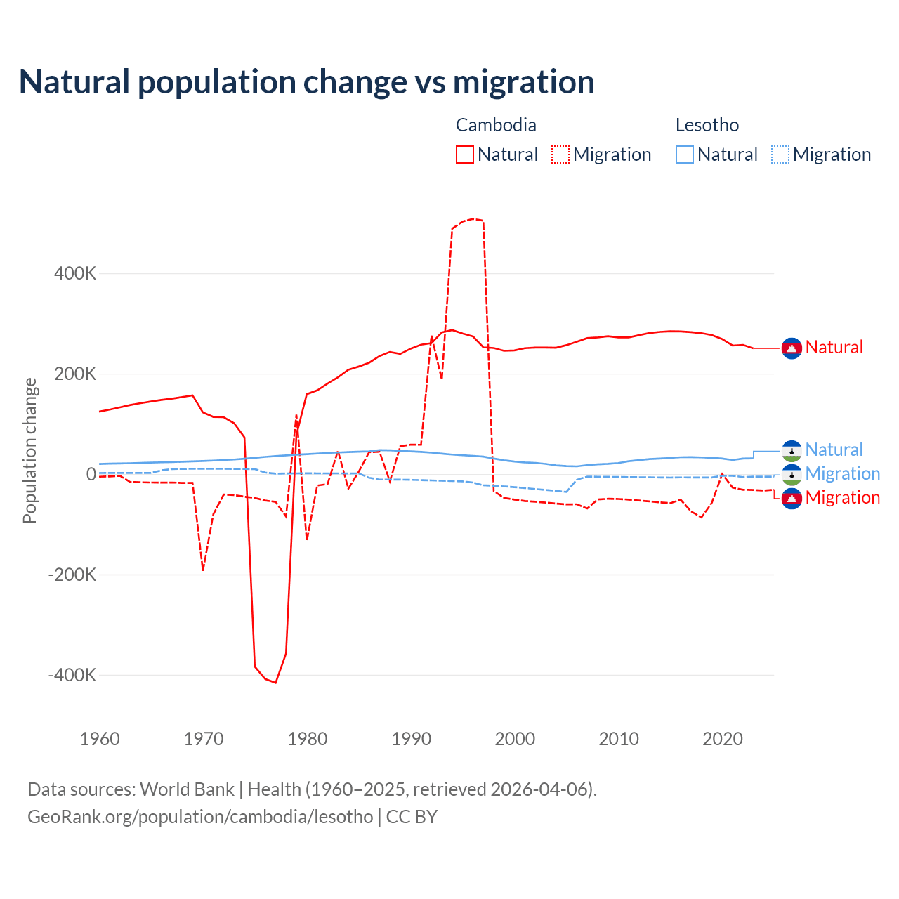Over the last 10 years, 85.2% of the population change in Cambodia is from natural causes (a gain of 2,724,147 people) and 14.8% is from migration (a loss of 474,505 people). In Lesotho 84.2% is from natural causes (a gain of 315,836 people) and 15.8% is from migration (a loss of 59,457 people).
