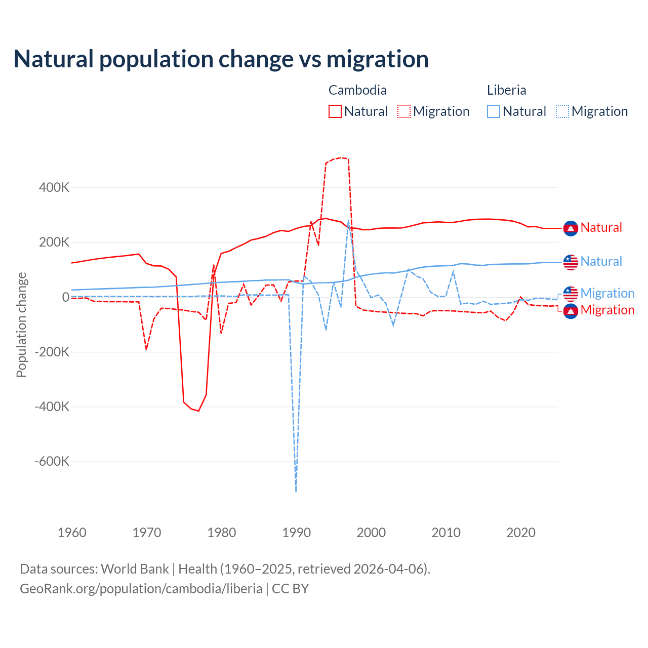 Over the last 10 years, 85.2% of the population change in Cambodia is from natural causes (a gain of 2,724,147 people) and 14.8% is from migration (a loss of 474,505 people). In Liberia 87.7% is from natural causes (a gain of 1,202,387 people) and 12.3% is from migration (a loss of 168,316 people).
