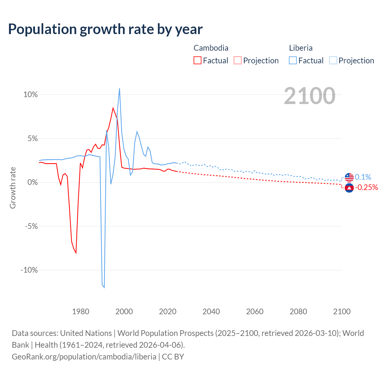- For the last 10 years, Cambodia has had an average growth rate of +1.38% per year vs +2.09% in Liberia.
