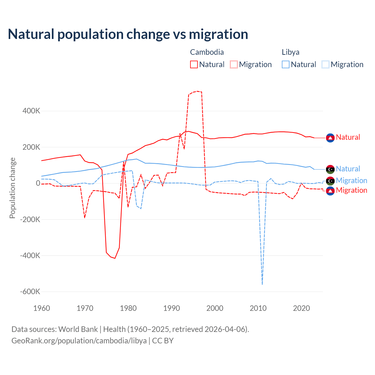 Over the last 10 years, 85.2% of the population change in Cambodia is from natural causes (a gain of 2,724,147 people) and 14.8% is from migration (a loss of 474,505 people). In Libya 99.4% is from natural causes (a gain of 975,799 people) and 0.63% is from migration (a loss of 6,150 people).