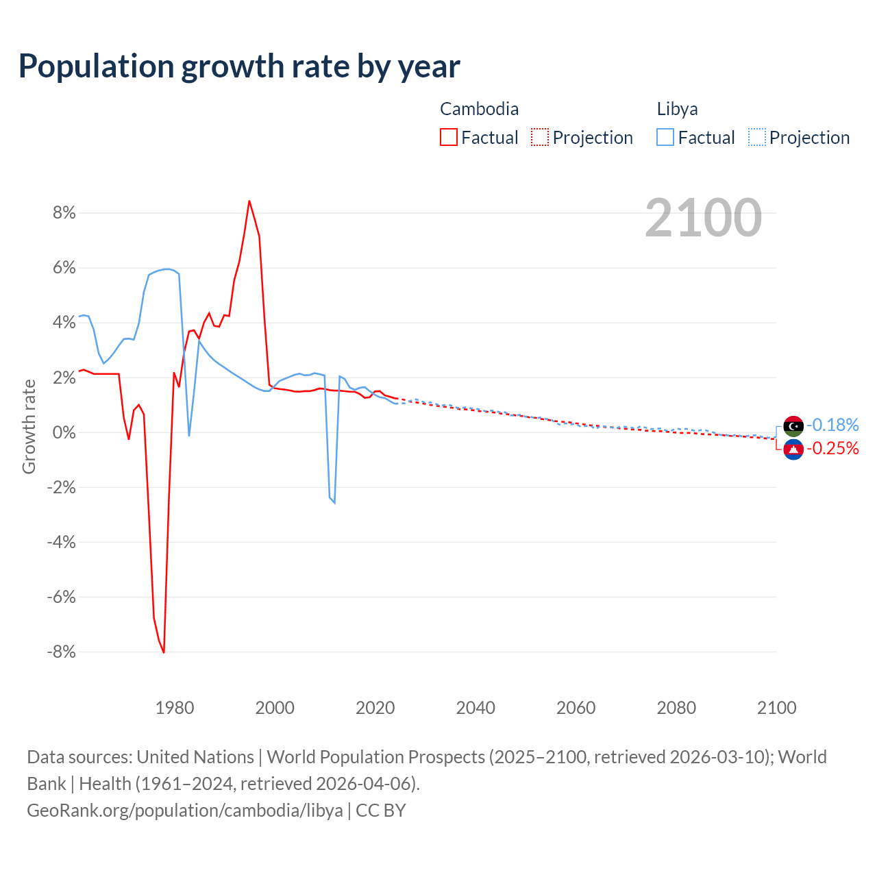 - For the last 10 years, Cambodia has had an average growth rate of +1.38% per year vs +1.44% in Libya.