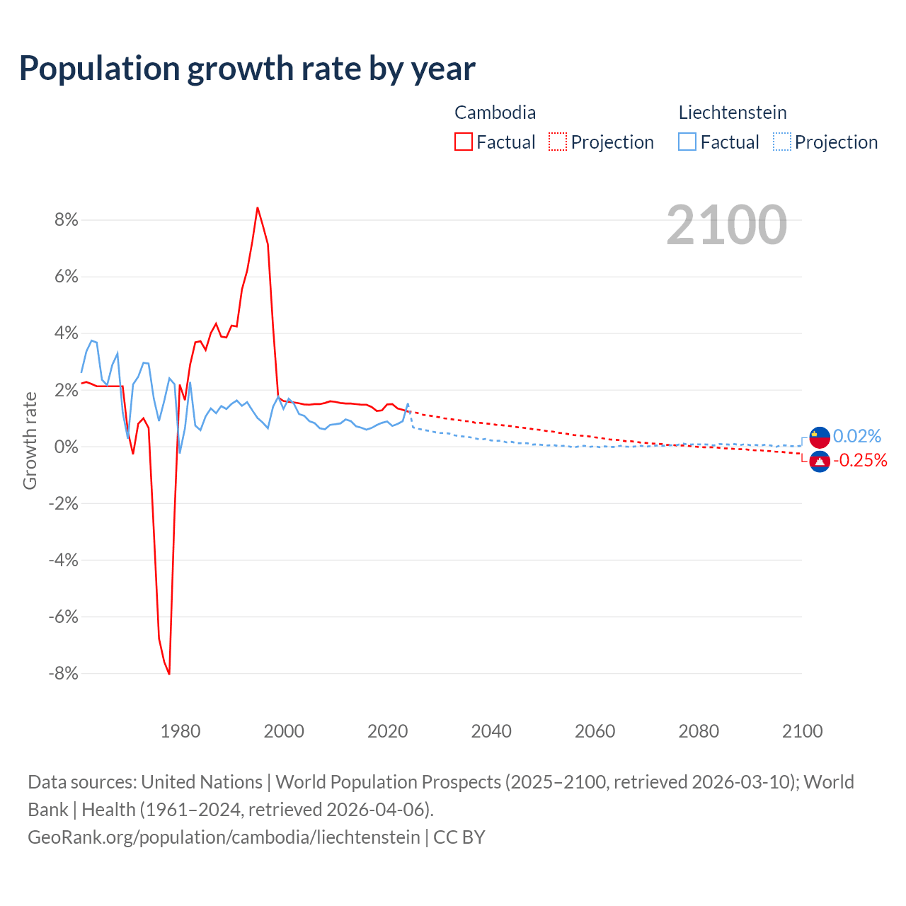 - For the last 10 years, Cambodia has had an average growth rate of +1.38% per year vs +0.82% in Liechtenstein.