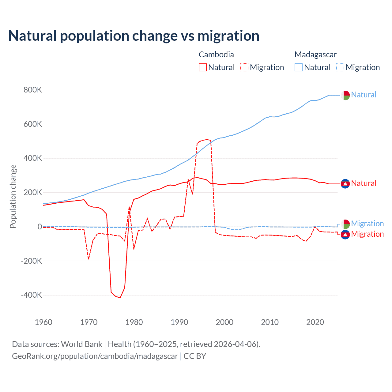Over the last 10 years, 85.2% of the population change in Cambodia is from natural causes (a gain of 2,724,147 people) and 14.8% is from migration (a loss of 474,505 people). In Madagascar 99.7% is from natural causes (a gain of 7,165,578 people) and 0.31% is from migration (a loss of 22,384 people).