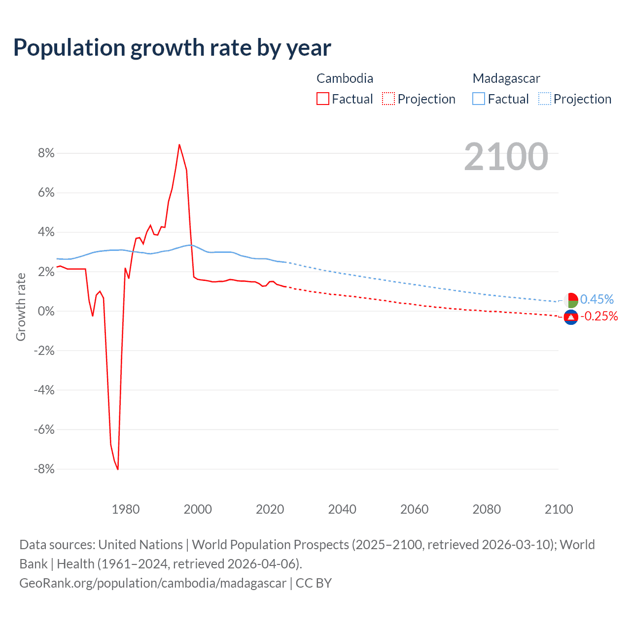 - For the last 10 years, Cambodia has had an average growth rate of +1.38% per year vs +2.6% in Madagascar.