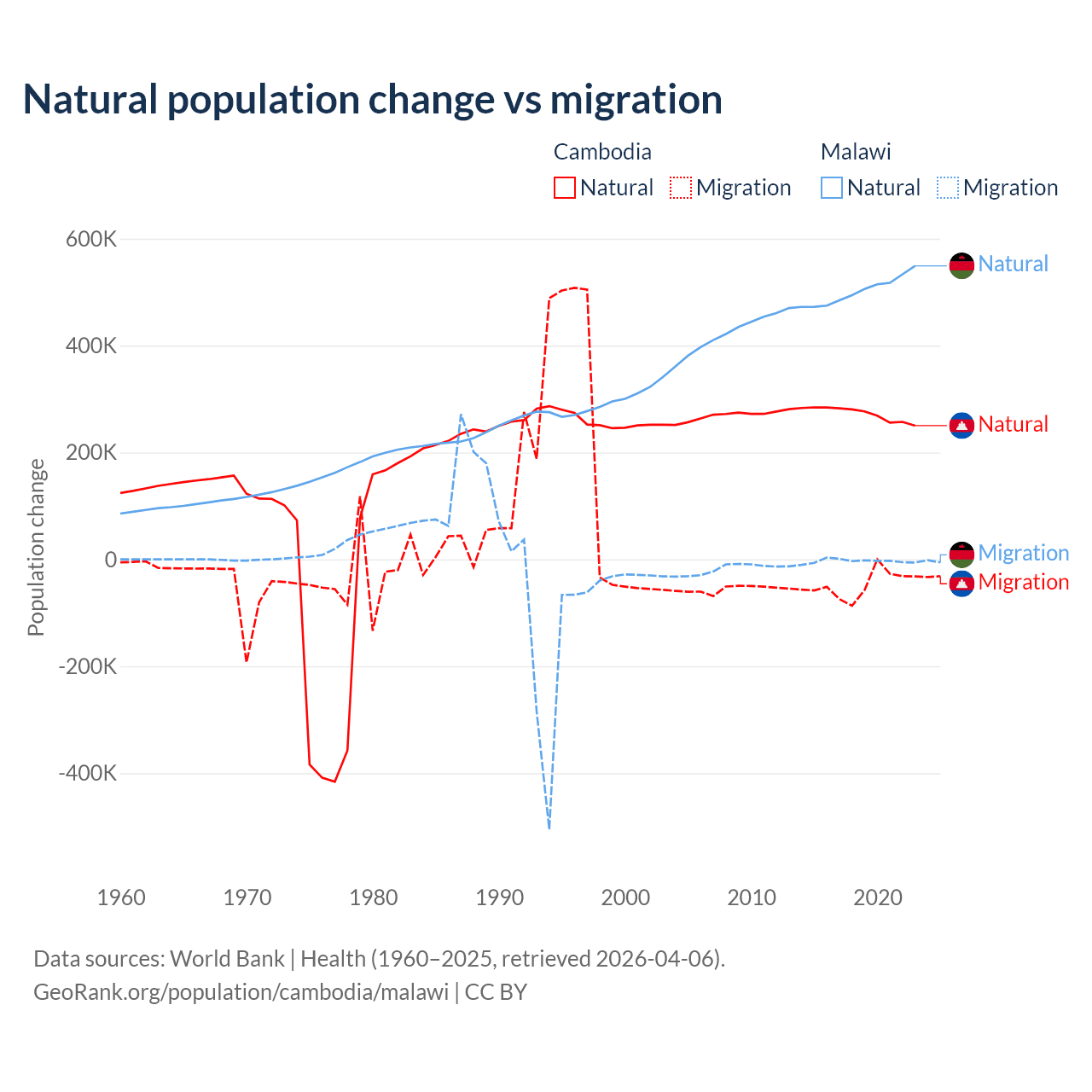 Over the last 10 years, 85.2% of the population change in Cambodia is from natural causes (a gain of 2,724,147 people) and 14.8% is from migration (a loss of 474,505 people). In Malawi 99.3% is from natural causes (a gain of 5,019,393 people) and 0.67% is from migration (a loss of 33,768 people).