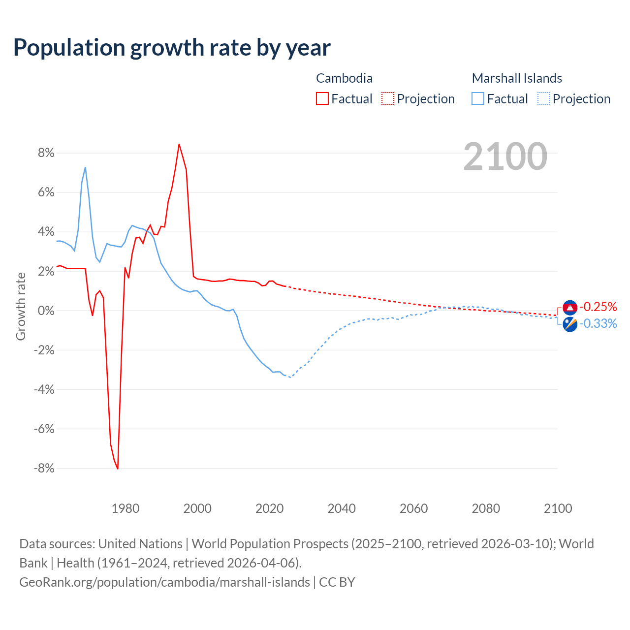 - For the last 10 years, Cambodia has had an average growth rate of +1.38% per year vs -2.69% in the Marshall Islands.