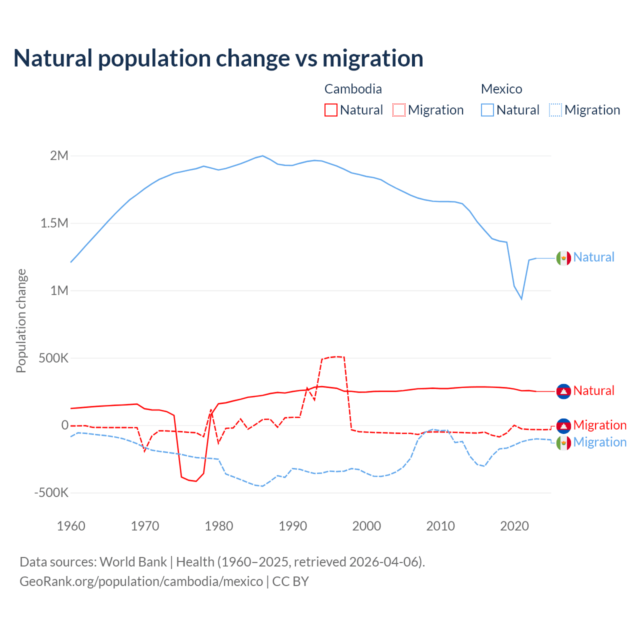 Over the last 10 years, 85.2% of the population change in Cambodia is from natural causes (a gain of 2,724,147 people) and 14.8% is from migration (a loss of 474,505 people). In Mexico 87.5% is from natural causes (a gain of 13,080,136 people) and 12.5% is from migration (a loss of 1,876,544 people).