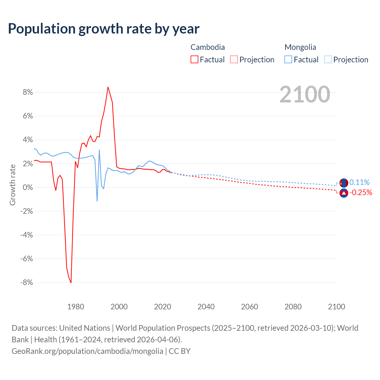 - For the last 10 years, Cambodia has had an average growth rate of +1.38% per year vs +1.79% in Mongolia.