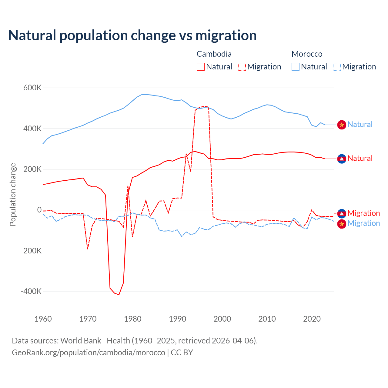 Over the last 10 years, 85.2% of the population change in Cambodia is from natural causes (a gain of 2,724,147 people) and 14.8% is from migration (a loss of 474,505 people). In Morocco 88.3% is from natural causes (a gain of 4,495,223 people) and 11.7% is from migration (a loss of 594,083 people).