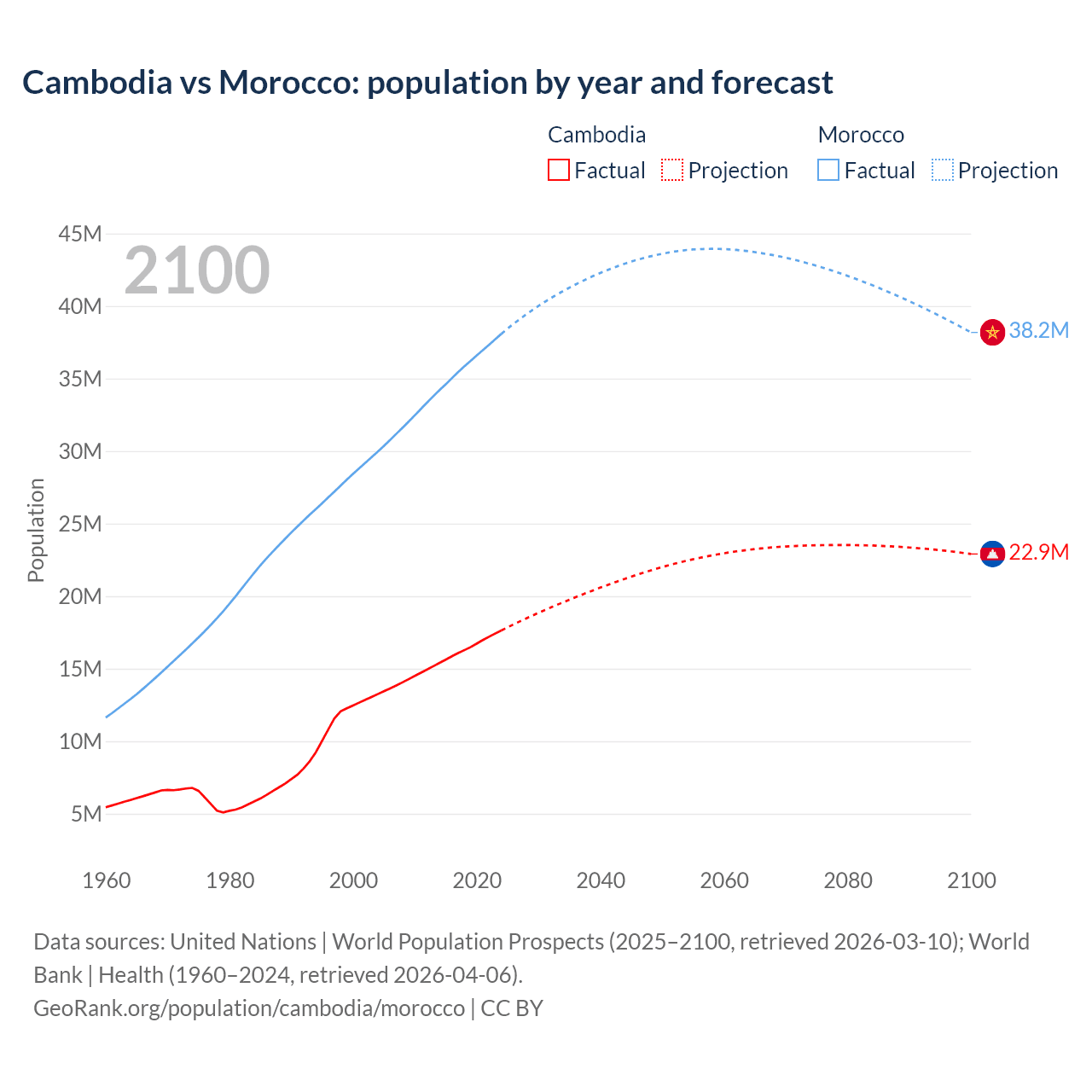 Cambodia vs Morocco: population by year and forecast